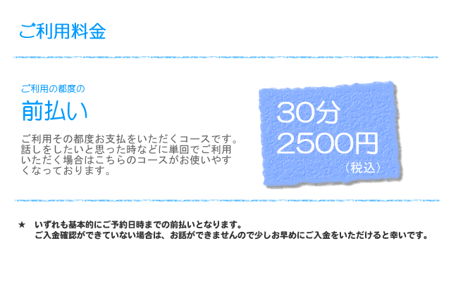 〜 初回は15分無料!通常(2回目以降のお客様)のご利用料金表は以下です。 〜